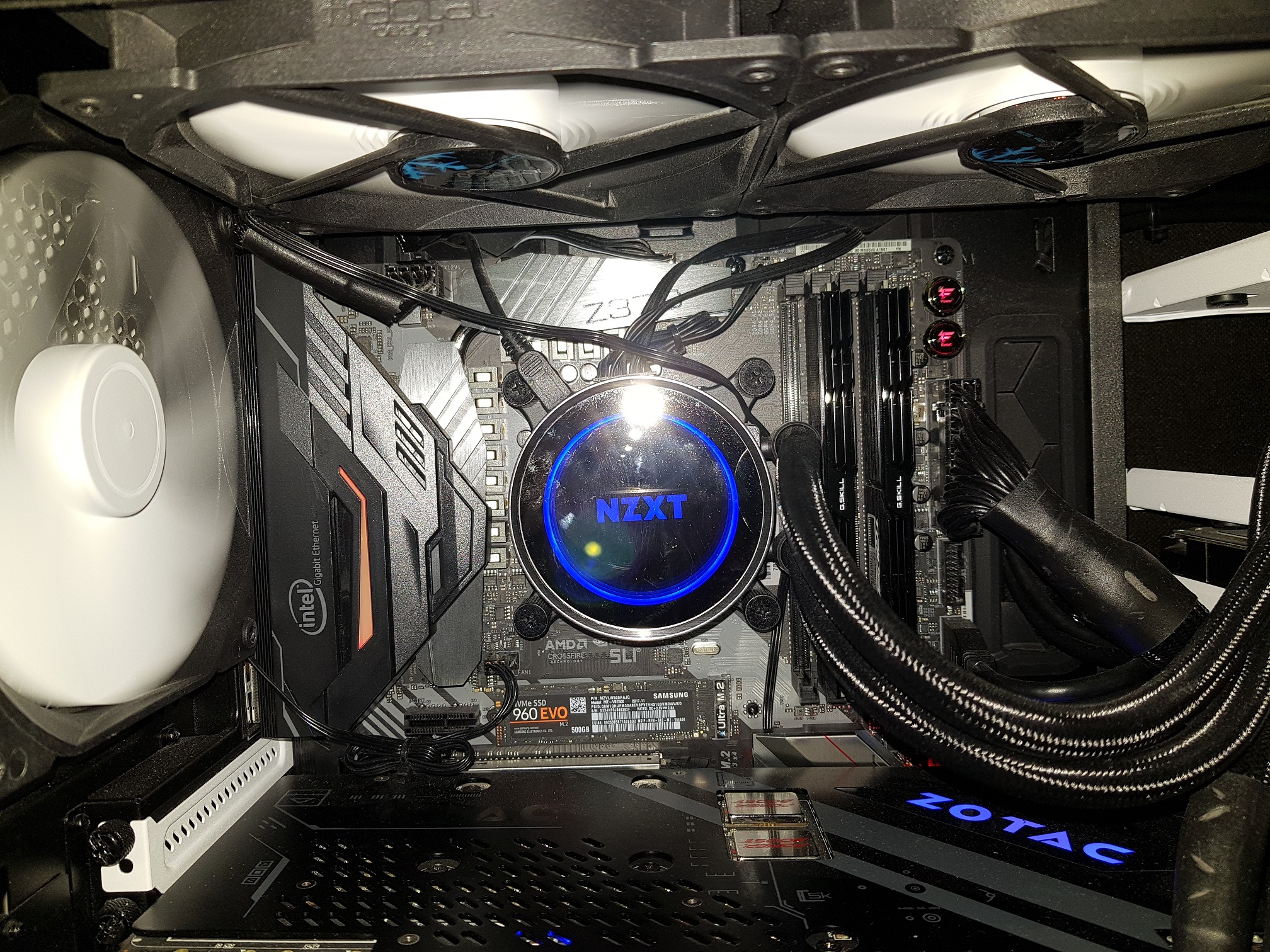 MB: ASROCK Fatal1ty Z370 Gaming K6 CPU: Intel Core i7-8700K @ 5,1GHz/4,9 AVX/4,6 cache; 1,41V Delid FAN: NZXT Kraken X62 RAM: G.SKILL 2x8GB DDR4 3800MHz @ CL16 TridentZ 1,5V GPU: Zotac GTX 1080Ti AMP Extreme Core Edition (11GB) SSD: Samsung 960 EVO 500GB, 850 EVO 500GB, 840 EVO 120GB HDD: WD Blue 2x4TB PSU: Corsair RM850i Case: Fractal Design Define R6 Black TG Monitor: BenQ XL2411Z