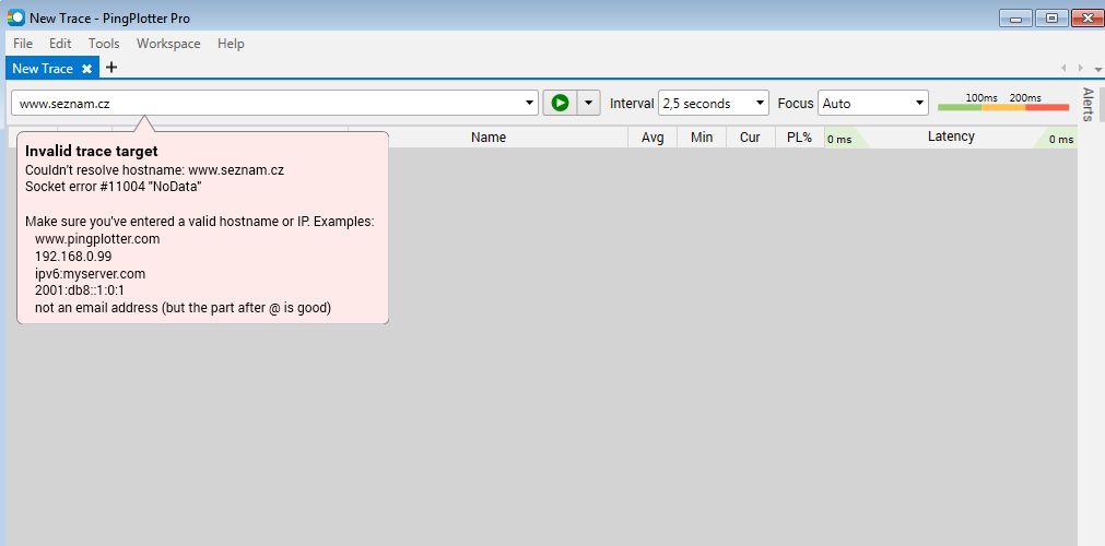 A u toho PingPlotter jsem zadala seznam.cz a dostala jsem tuto hlášku