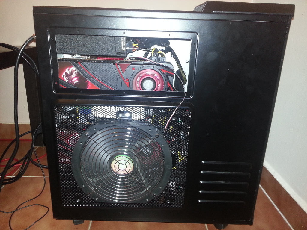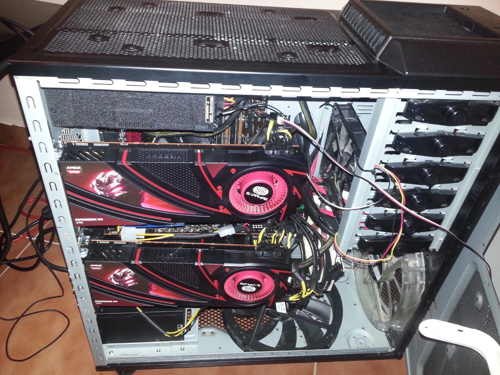 Není úplně celé moje, ale z části ano - uvnitř 4x R9 290 GK, ikdyž vidět jsou spíše jen 2. S kamarádem jsme měli velkou radost, že se nám to podařilo vše narvat do CASE