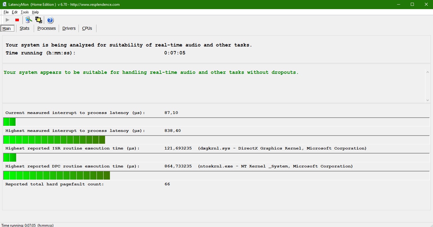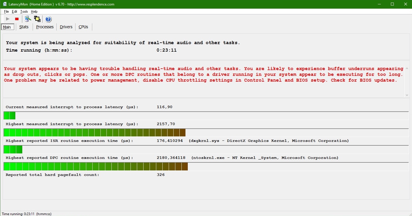 Ale mě právě nejvíc štvalo to lupání. Jsem rád, že jsem přišel na to, že bez momentum cache to nelupe, tak ho prostě nebudu zapínat, ovladače dám jen ty co být musí a užívám si muziky a videí bez prskanců. To upozornění o kterým píšeš, to je když se ti zvedne latence přes asi 2000, tak je to stále stejné - prostě je "nekde" problém. Teď jsem DPC měl puštěný asi půl hodiny a jsem v pohodě, jen by to mohlo být zelený, to by bylo ještě lepší: