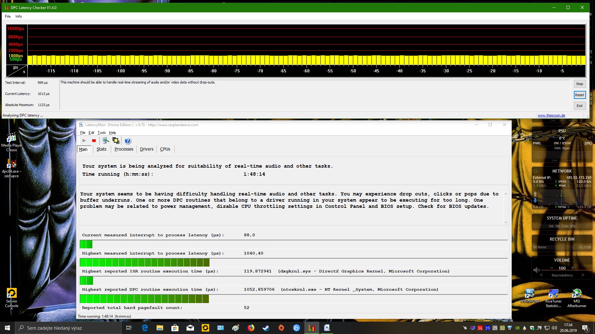 RIKI, o LatencyMon vím, psal jsem o něm, taky ho používám na testy. Zrovna teď koukám na film, tak jsem ho na pozadí zapnul a zde jsou dva výsledky, cca po 15 a po 25 minutách. (nemám zapnutý momentum cache)