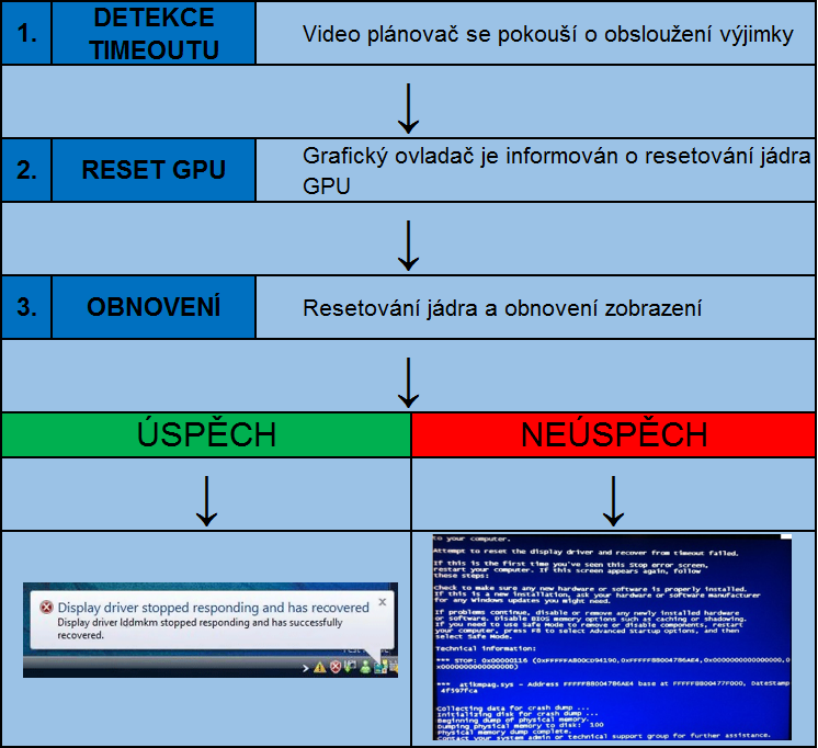 Posledním krokem je samotný reset jádra a uvolnění videopaměti, realokování paměťového prostoru ovladače a následné obnovení zobrazení. V některých případech se obnovení nezdaří, protože vlákno ovladače v bodu č. 2 vytuhne a dojde k jeho zavěšení. Systém tuto skutečnost vyhodnotí jako nemožnost obnovení ovladače a dojde k zastavení systému se STOP kódem 0x116 VIDEO_TDR_ERROR . Pokud k tomuto dochází, je nejlepší vložit příspěvek do BSOD sekce, kde se můžeme věnovat problému podrobněji.