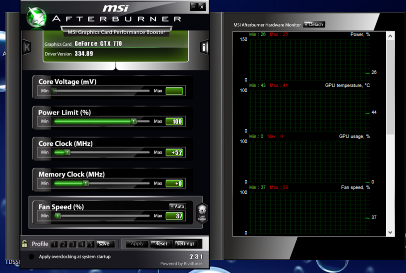 Jinak nastavení je takovéto (musel jsem zvednout otáčky nasávacího větráku, aby se to drželo do 90°C) Ale zatím to nechám jen tak lehce popohnané na úroveň R9 270X HAWK