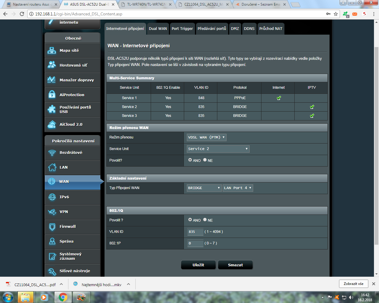 mám problém s novým routerem. Koupil jsem Asus dsl-ac52u jako náhradu za originál od O2 Zyxel VMG1312, který absolutně nestíhal, vzhledem k tomu že přes něj jely 2 O2tv, počítač, NAS, notebooky na wifi, mobily, xbox.. prostě dost věcí. :D Rozhodl jsem se tedy pro tento asus. Momentálně je síť zapojená takto: Asus, z něho vytažený kabel do 2 tv, PC a TP-linku WR-740N v módu AP, za ním switch a do něj MMC, xbox a NAS. Druhé MMC se připojuje zatím přes wifi na asus. Teď k problému: