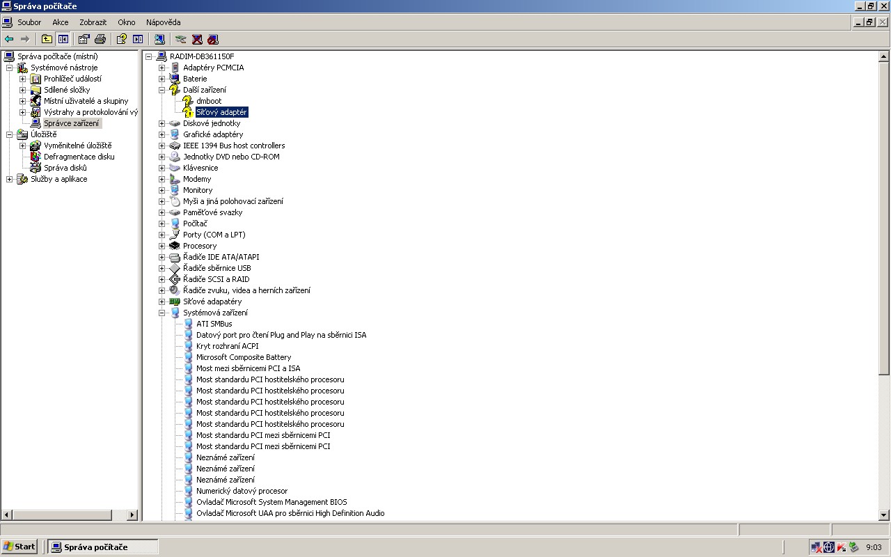 Správce zařízení ukázal žlutý otazník Další zařízení /dmboot a sítový adaptér žlutý otazník s černý vykřičníkem . aktualizace ovladačů se nadaří a hlásí Hardware nebyl naistalován , nenalezen nezbytný software.Stále chybí ovladač klávesnice terminálového serveru . Ke bych tyto ovladače mohl stáhnout...