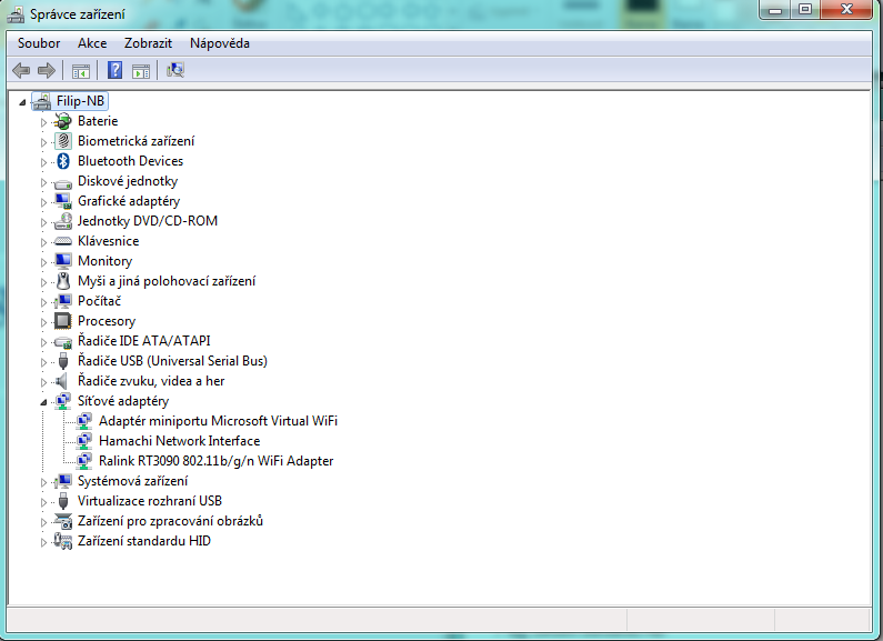 Vypnul jsem Virtual Wifi a odinstaloval Hamachi. Teď v síťových zařízeních mám jen Ralink RT3090 802.11b/g/n WiFi Adapter. Centrum připojení vypadá takto. V pravo dole mám červený křížek i přesto že přístup k internetu mám. Myslím si že došlo k odinstalování (omylem) nějaké knihovny nebo ovladače kt...