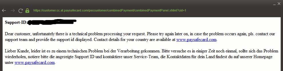 Zdravím vás, před dvěmi dny jsem se rozhodl koupit hru přes steam pomocí paysafecard. Zboží dám do košíku, zvolím způsob platby paysafecard, postupuju dál a když se dostanu k přihlášení na můj psc účet, zadám údaje, potvrdím enterem a nic. Vyhodí to hlášku, že mám kontaktovat support. Tak jsem učini...
