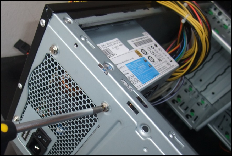 K montáži budeme potřebovat jen křížový šroubovák a možná kleště.Pokud tedy máme zakoupeny všechny potřebné komponenty ,tak se můžeme pustit do sestavení počítače.Po vybalení věcí začneme tím,že osadíme do skříně zdroj.Nasuneme jej zevnitř skříně ventilátorem dole a zezadu přišroubujeme šroubky s hrubým závitem.