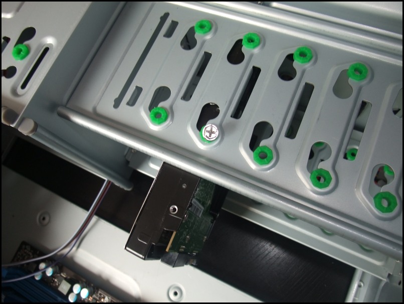 Osazení pevného disku je podobným způsobem.Disk se nasadí zevnitř do nižších pozic v case a zajistí čtyřmi šrouby s hrubým závitem a nebo taktéž rychloupínacím mechanismem.Při vložení disku ho osazujeme podle desky tak,aby nebyl naproti PCIe slotu pro grafiku,protože by pak nemuselo být dostatek místa na její vložení.Takže raději níž nebo výš než grafika.