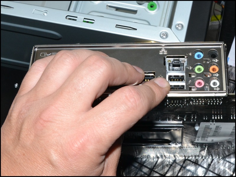 Nyní si můžeme připravit desku pro montáž.Nejdříve připasujeme zadní krytku konektorů.Plíšky kolem výstupů pro konektory pozohýbáme dovnitř a nasadíme krytku na desku tak,aby pasovala.Krytku poté můžeme sundat a vložit na její místo ve skříni pod zdrojem.