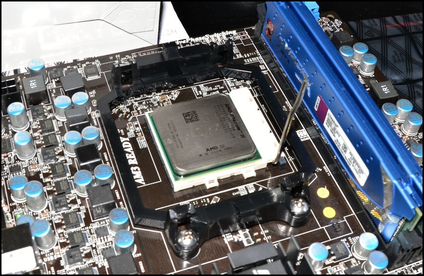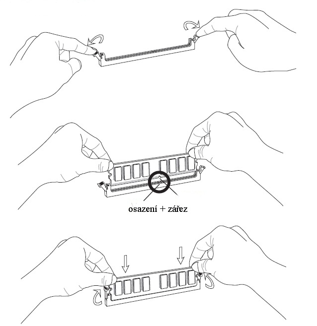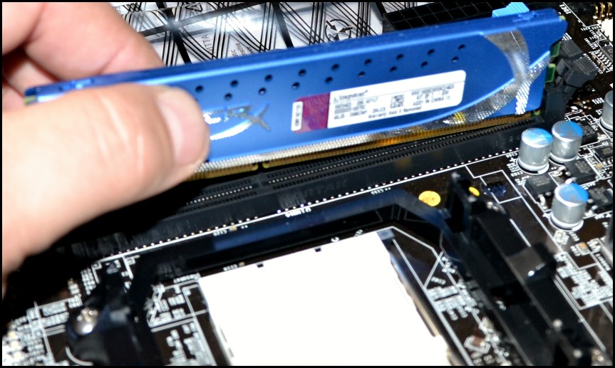 Teď obvykle přichází na řadu montáž pamětí.Postup je jednoduchý.Odjistíme zajišťovací klapky směrem od slotu.Nasadíme paměťové moduly,tak aby zářez zapadl do výstupku na slotu,mírně zatlačíme na jedné straně dokud klapka necvakne a pak dotlačíme druhou stranu pamětí do slotu opět tak aby to zacvaklo.Toť vše.Osazujem sloty blíže k patici procesoru a stejné barvy.