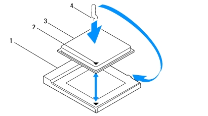 Pokud procesor dobře sedí,tak páčku sklopíme a zajistíme ve spodní poloze patice.Z pohledu schematického obrázku níže je jako č.1 označena patice procesoru,č.2 je šipka na procesoru,č.3 je samotný procesor a č.4 zajišťovací páčka.