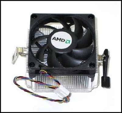 Po úspěšném usazení procesoru nasadíme chladič.Orginál box chladič AMD se uchycuje pomocí spon a páčky.Orientujeme chladič tak,aby vybrání jeho hliníkové části bylo nad výstupkem patice - přesně tam jak ukazuje č.1 na horním obrázku.Plastovou páčku na chladiči dáme do vrchní polohy.Sponu na protější straně zahákneme do výstupku,to samé provedeme ze sponou na druhém konci pod páčkou.Pak páčku tlačíme směrem dolů k patici.Může to jít trochu ztěžka,takže musíme překonat mírný odpor a páčku docvaknout až do spodní polohy.Tím máme chladič uchycený.