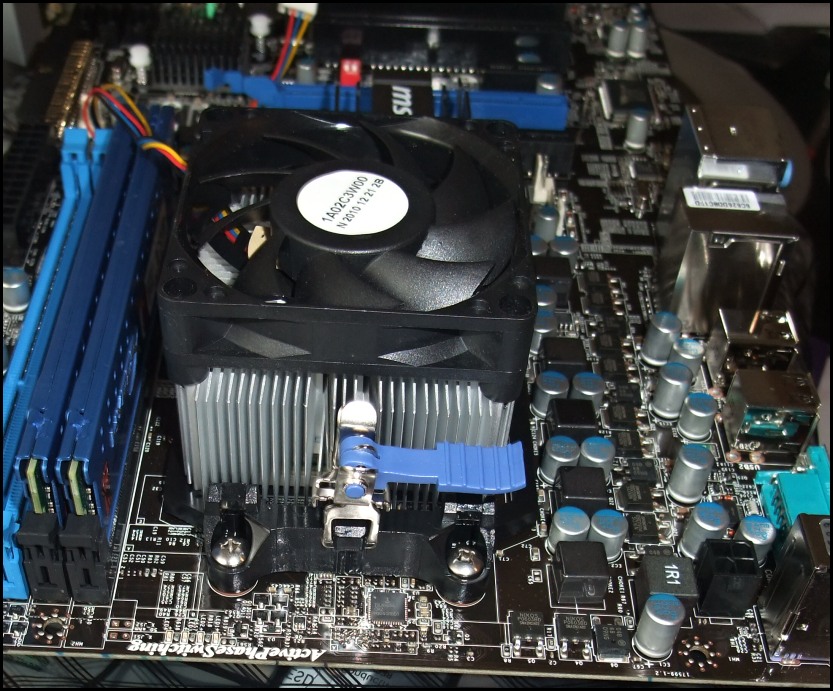 Postup montáže chladiče procesorů Intel je trochu odlišný.Tam nasadíme celý chladič na desku nad otvory pro tento chladič a zamáčkneme plastové kolíčky,které pootočením zaaretují trny zespod desky.