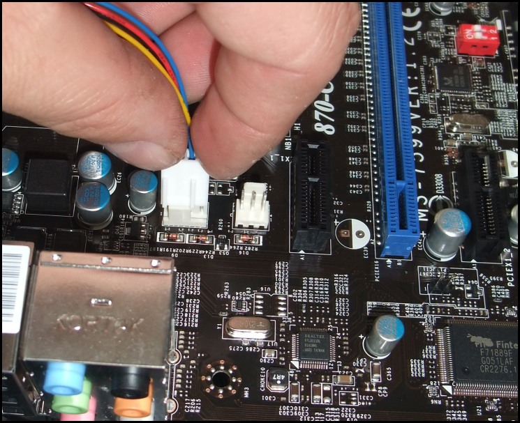 Zbývá jen zapojit kablík od ventilátoru do konektoru CPU Fan na desce.Jedná se o malý čtyřpinový konektor umístěný většinou poblíž patice procesoru.Díky zářezům nejde dát opačně,takže to není problém.Pozor - neplést s podobným konektorem SYS Fan.Nic by se sice nestalo,chladič by fungoval,ale tento konektor je určen pro systémové ventilátory a nemá většinou možnost regulace tak jako CPU Fan.Viz obrázek níže: