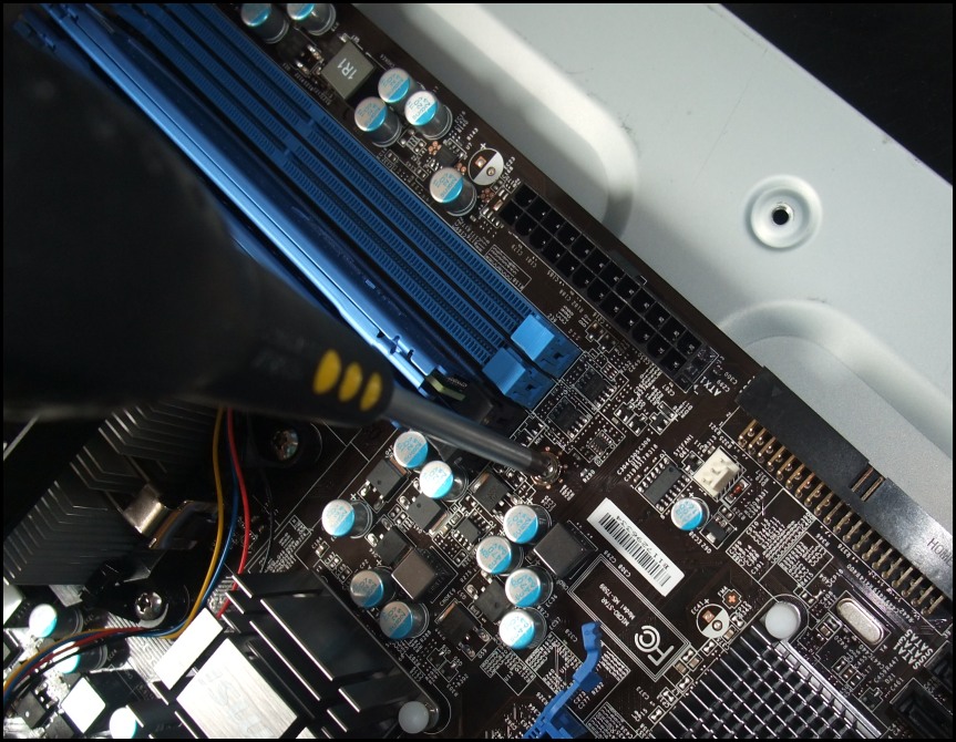 Nyní je deska mimo grafiky kompletně osazena a můžeme ji namontovat do case.Opatrně ji vkládáme zeshora dozadu směrem k zadní záslepce konektorů až do ní konektory vlezou.Pak ji položíme.Měli bychom vidět pod otvory v desce závity od distančních šroubků.