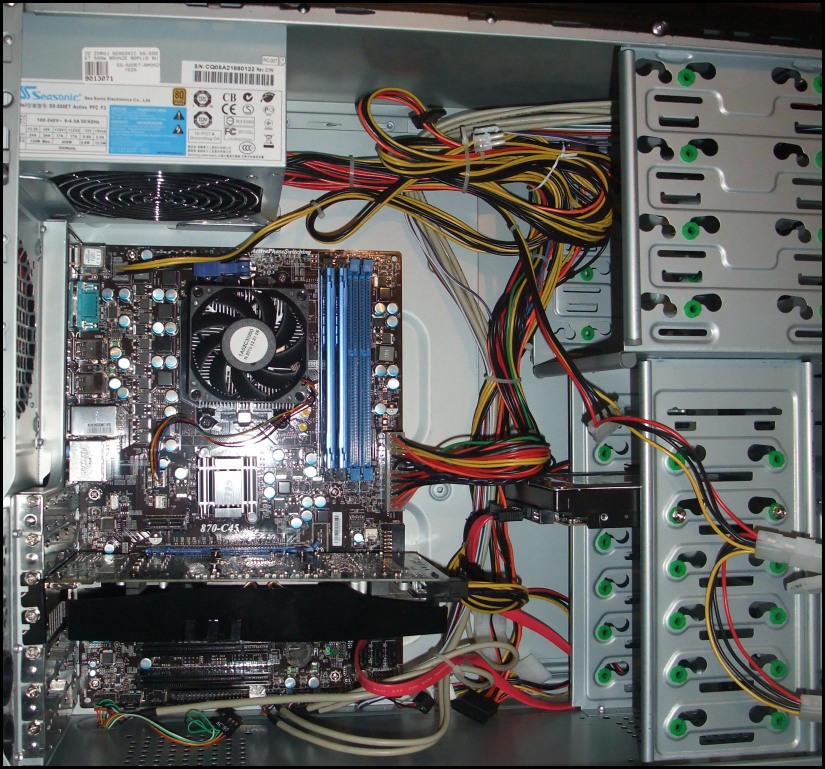 Kabely od zdroje a disků ve skříni trochu svážeme a uklidíme aby nepřekážely proudu vzduchu.Výsledek by měl vypadat nějak takhle: