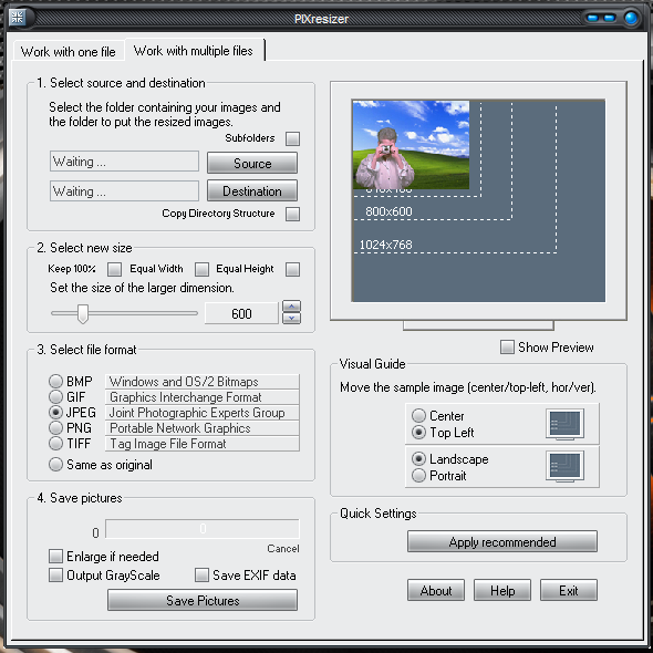 PIXresizer je aplikace pro dávkovou změnu rozměrů vybraných obrázků a digitálních fotografií. Podporovány jsou grafické formáty JPEG, GIF, BMP, PNG a TIFF. Fotografie je navíc možno rotovat, převést do odstínu šedé a provádět jejich vzájemnou konverzi atd. PIXresizer také dokáže zobrazit EXIF informace z digitálních fotografií.