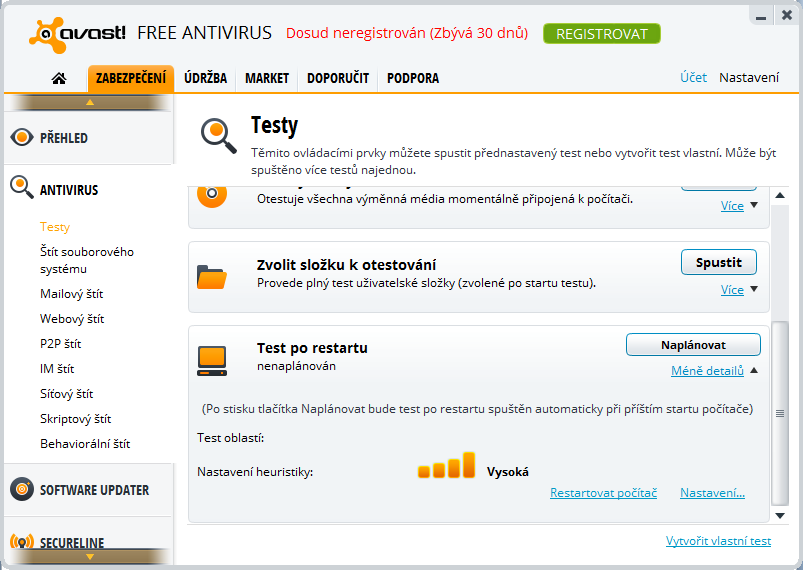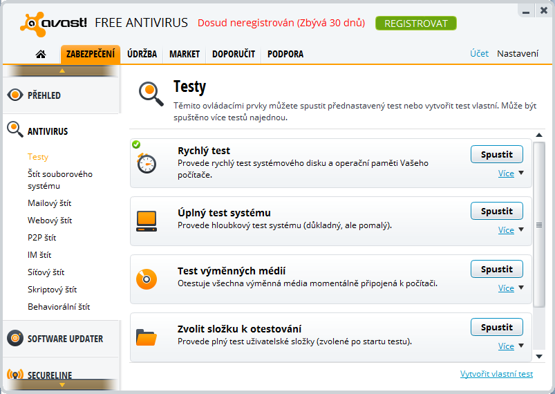 Vedle proaktivní ochrany v reálném čase je samozřejmostí také ochrana v podobě manuálně spustitelných testů. Nabízí se jak rychlý kompletní test počítače, tak důkladný kompletní test, který ale trvá delší dobu. Otestovat lze i obsah vybrané složky anebo obsah přenosných médií, která jsou už delší dobu hojně zneužívaná k šíření záškodnických programů z počítače do počítače jako za časů disket.
