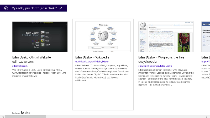 Ve výchozím nastavení jsou nabízeny relevantní výsledky vyhledávání z obsahu na pevném disku, úložiště SkyDrive, voleb nastavení systému a také z Internetu, kde Windows 8.1 prostřednictvím vyhledávače Bing vyhledávají relevantní weby, obrázky a videa. Z tohoto výčtu se může zdát, že výsledky vyhledávání budou jedním velkým chaosem, ale opak je pravdou. Stránka s výsledky vyhledávání optimalizovaná pro dotykové ovládání je velmi přehledná.