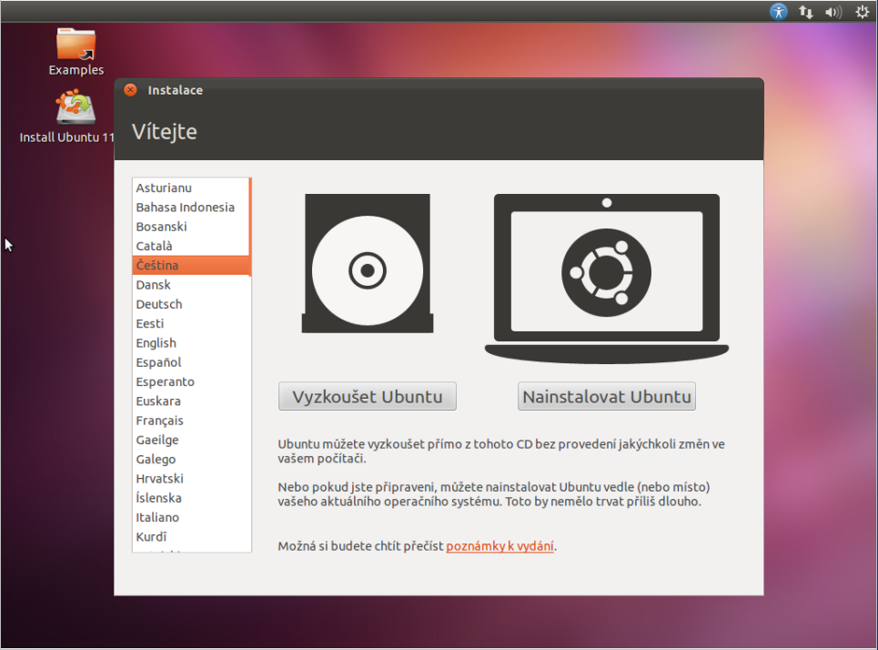 Ubuntu si můžete před instalací vyzkoušet, což je velice dobrá věc. Pokud nemáte s Linuxem zkušenosti, můžete si ho spustit z tzv. LiveCD, které jsme si vypálili. Pokud vyberete tuto možnost, můžete se Linuxem hrát jak chcete a nedotkne se vašich dat. Ovšem my chceme Ubuntu nainstalovat, takže klikneme na Nainstalovat Ubuntu
