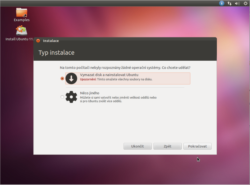 Dále to je rozdělení disku. Protože máme čistý počítač, objeví se mám něco podobného. Vyberte Vymazat disk a nainstalovat Ubuntu. Pokud máte na PC také Windows, tak se podívejte na Ubuntu WIKI (odkaz výše)