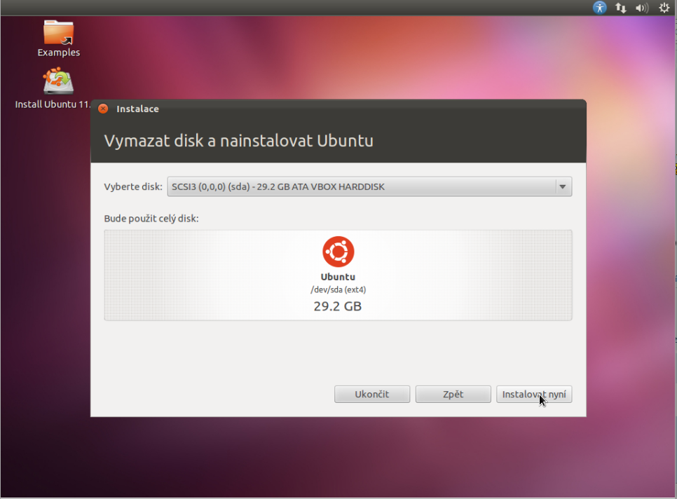 A tady se nám ukáže co hodlá instalátor s diskem udělat, máme čistý disk, takže ho celý zabere Ubuntu. Zvědavci si také všimnou, že používám virtuál :wink: Pokud vše sedí, klikneme na Instalovat nyní