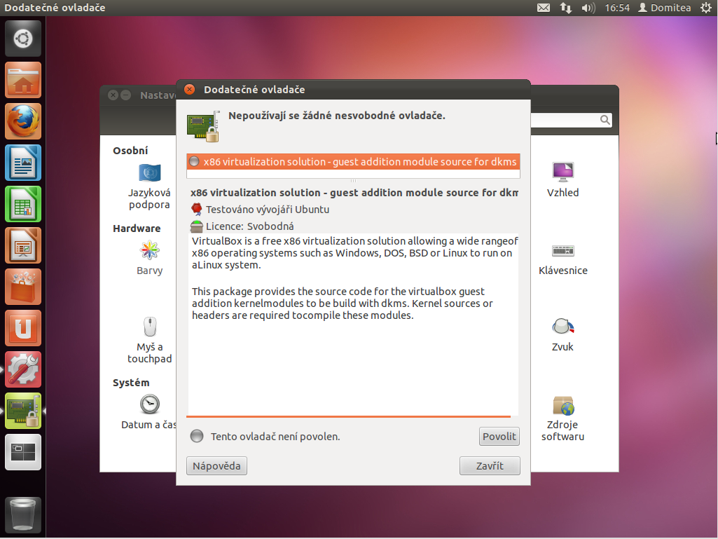 Můžeme zde aktivovat ovladače pro různá zařízení, většinou pro grafiky. Já tam mám jen možnost aktivování Guest additions, což jsou doplňky pro virtuální PC. Aktivace se provede označením daného ovladače a dole kliknete na Povolit