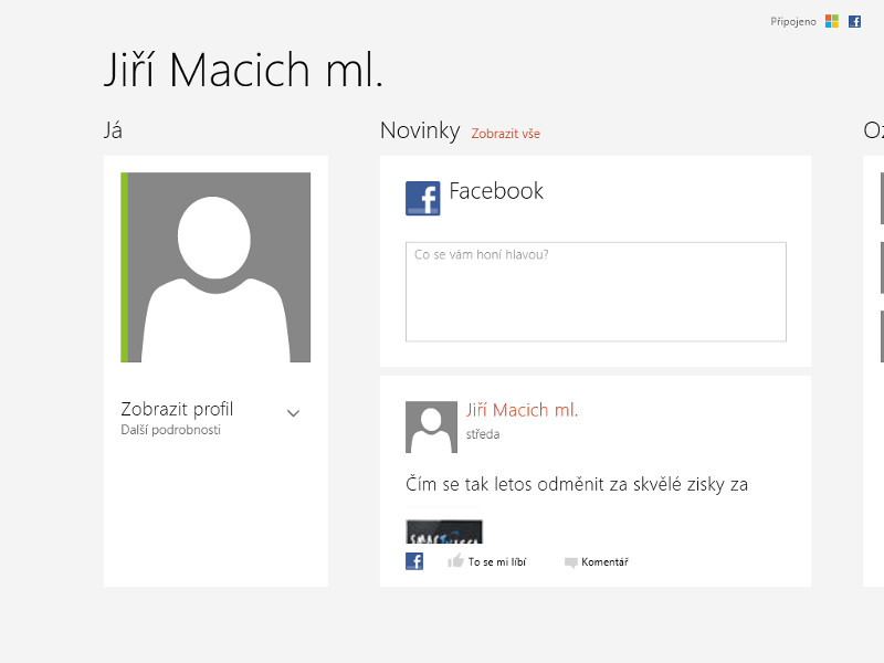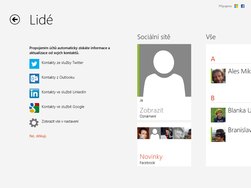 Nicméně aplikace Lidé (People) je atraktivní hlavně pro možnost jednotného přístupu k sociálním sítím. Po propojení s účtem lze otevírat profily kontaktů na sociálních sítích přímo v aplikaci Lidé (People). Samozřejmě lze sledovat veškeré dění na podporovaných sociálních sítí, posílat nové příspěvky a reagovat na příspěvky ostatních uživatelů. Škoda jen, že aplikace tentokrát není až tak jednoduchá a pochopit navigaci v ní nějakou chvilku trvá. Rozhodně existuje intuitivnější software.