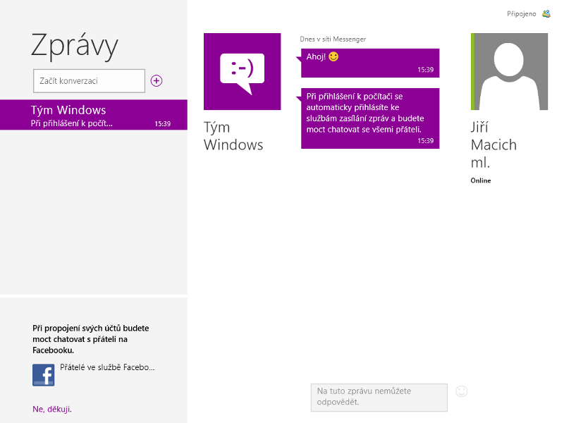 Kdo by čekal, že Microsoft svá nová Windows 8 vyšperkuje předinstalovanou aplikací Skype, když za službu loni utratil 8,5 miliardy dolarů, byl by na omylu. Aplikace Skype pro Modern UI je sice k dispozici, ale ve Windows Store. V základní nabídce předinstalovaných aplikací je její chabou náhražkou aplikace Zprávy (Messaging) sloužící výhradně pro textovou komunikaci v rámci služeb Microsoft Messenger a Facebook Chat.