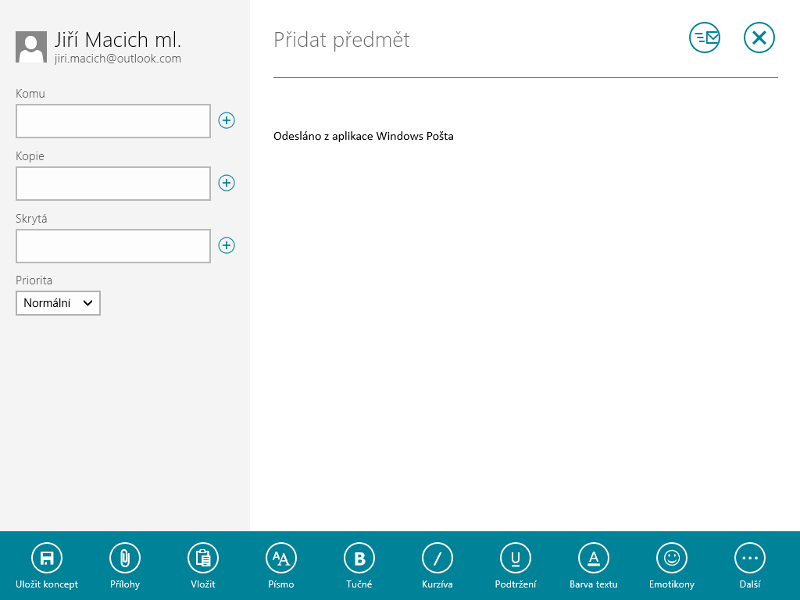 Aplikace slouží především pro rychlý pohled na doručenou poštu a případně odeslání nějaké té zprávy. Integrovaný editor podporuje základní formátování textu a vkládání obrázkových smajlíků (emotikonů). Nastavit lze prioritu odesílané zprávy a případně k ní přiložit jakýkoliv soubor. Jedinou zajímavější funkci aplikace Pošta (Mail) je možnost posílat objemné soubory prostřednictvím úložiště SkyDrive.