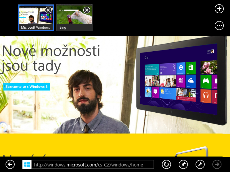 Poslední z dostupných tlačítek na spodní liště slouží k připnutí právě zobrazeného webu na domovskou obrazovku Start pro pozdější rychlý přístup k němu. Přímo v prohlížeči chybí tradiční funkce v klasickém podání, jako jsou oblíbené položky, historie navštívených webů, správce hesel a mnohé další. Microsoft dotykový Internet Explorer očesal doslova na kost. Až moc.