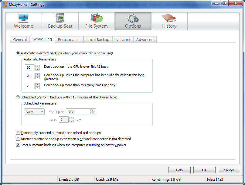K zálohování lze využít dobu, kdy počítač zrovna není vytížen, přičemž je možné povolit automatické zálohování po uplynutí stanové doby nečinnosti a zároveň při zatížení procesoru pod stanovenou hranici. Efektivně tak je možné využít dobu, kdy počítač běží (a spotřebovává stále dražší elektřinu), ale nikdo na něm nepracuje. Nicméně problém nepředstavuje ani zálohování při práci na počítači, protože MozyHome není žádným pojídačem systémových prostředků.