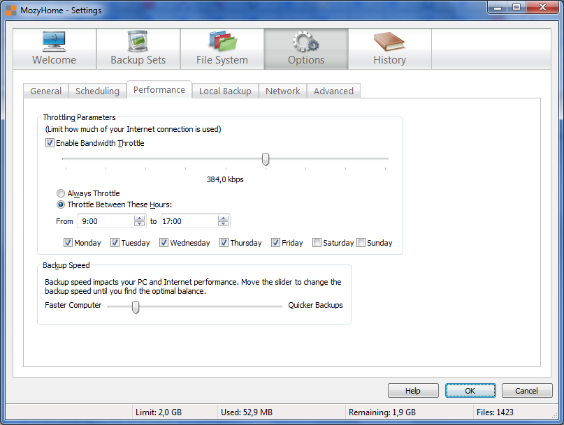Navíc je tu možnost nastavit poměr mezi dostupným výkonem počítače a rychlostí zpracování zálohy. Podle tohoto nastavení si pak obslužný program usurpuje systémové prostředky. Může jich tedy ponechat dostatek třeba i pro hraní náročných her. Pokud byste se obávali, že přenos souborů by měl znepříjemňovat práci s Internetem, tak můžete být klidní. Lze si totiž nastavit rychlostní limit pro odesílání souborů do internetového úložiště.