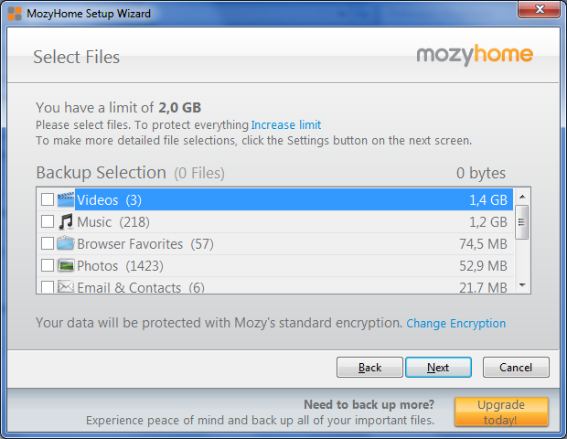 Obslužný program MozyHome automaticky zálohuje vybrané typy souborů, které nalezne napříč pevným diskem. Může zálohovat například dokumenty, videa, fotky, hudbu nebo e-maily. Není nutné vybírat konkrétní složku, kde se data k zálohování nacházejí. Ovšem samozřejmě je možné obejít jednoduché rychlé nastavení a ručně si vybrat složky z pevného disku, které mají být zálohovány.
