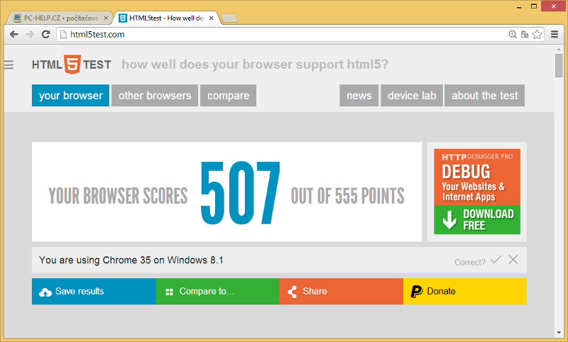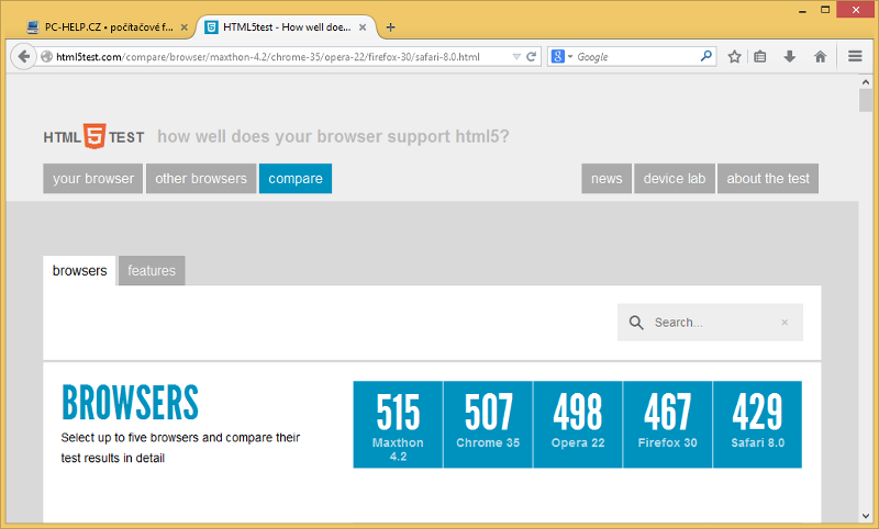 Vraťme se ale ještě k orientačnímu testu podpory HTML 5 na html5test.com. Za zmínku stojí, že Google Chrome sice z trojice nejrozšířenějších prohlížečů dlouhodobě získává nejvíce bodů, ale absolutní prvenství drží Maxthon s jádrem WebKit. Jeho aktuální verze 4.2 dosahuje skóre 515 bodů. Teprve na druhém místě je Google Chrome s aktuální verzí 35.0, která získává 507 bodů.