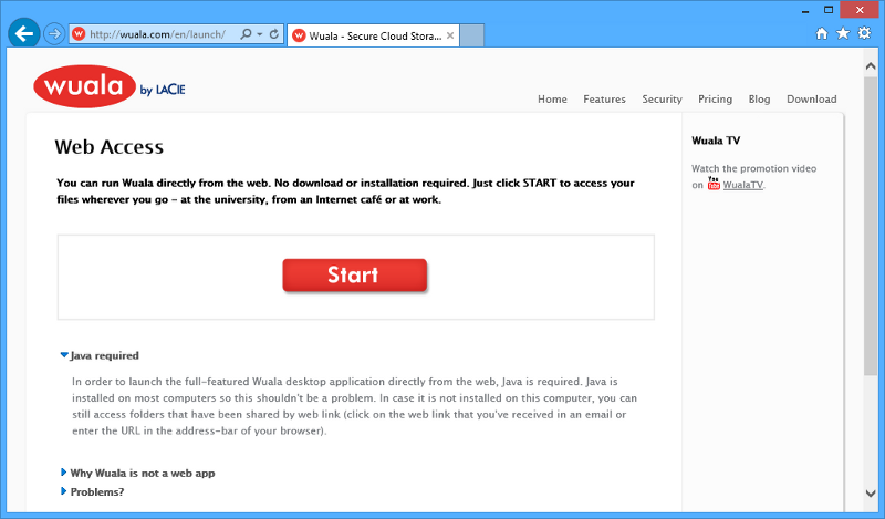 Konkrétní důvod je v tom, že soubory jsou šifrovány a dešifrovány vždy až na straně uživatele pomocí hesla, která rovněž zůstává výhradně na straně uživatele. Namísto webového rozhraní Wuala alespoň na svých webových stránkách nabízí spuštění obslužného programu bez nutnosti předchozí instalace. Zde služba opět těží z toho, že její program je napsán v Javě.