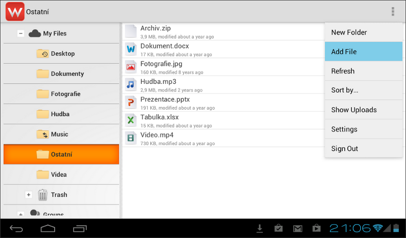 Poskytovaná aplikace pro chytrou mobilní elektroniku samozřejmě podporuje základní funkce pro správu souborů v cloudovém úložišti. Kromě toho, že je možné jednotlivé soubory stahovat a otevírat v příslušené aplikaci třetí strany, lze též z cloudu streamovat audio či video s pomocí volitelného přehrávače. Pro přehrávání multimédií tak není nutné čekat na kompletní stažení souboru.