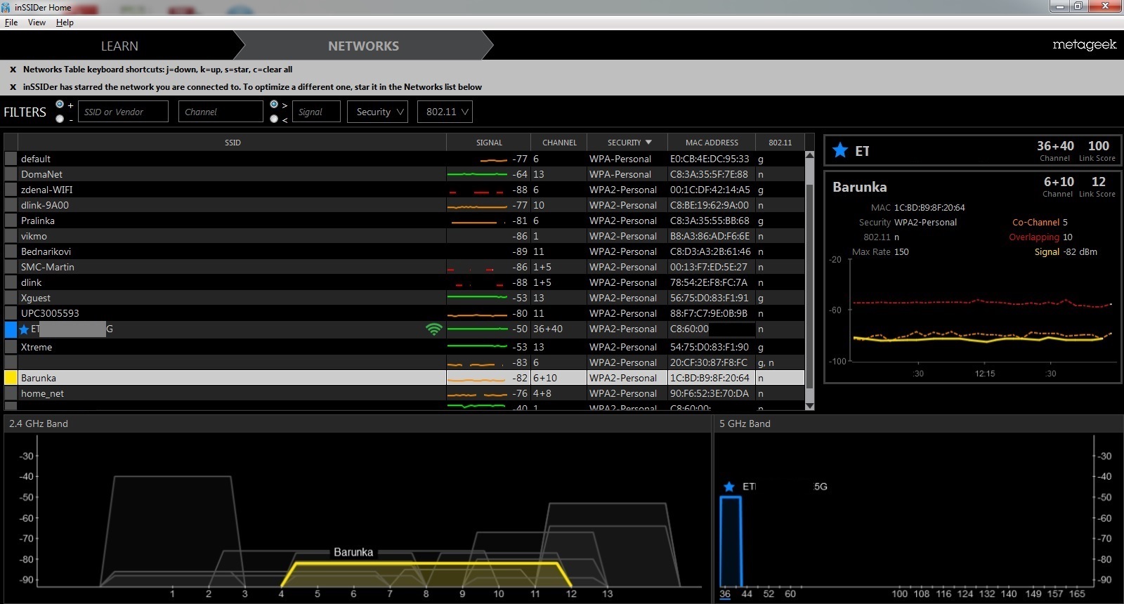 Pro analýzu, jak to vlastně ve vašem okolí vypadá můžete použít program inSSIDer. Majitelé chytrých telefonů z androidem mohou využít WiFi analyzer, který přehledně ukáže okolní WiFi sítě. V programu inSSIDer to vypadá takto: Co lze vyčíst?