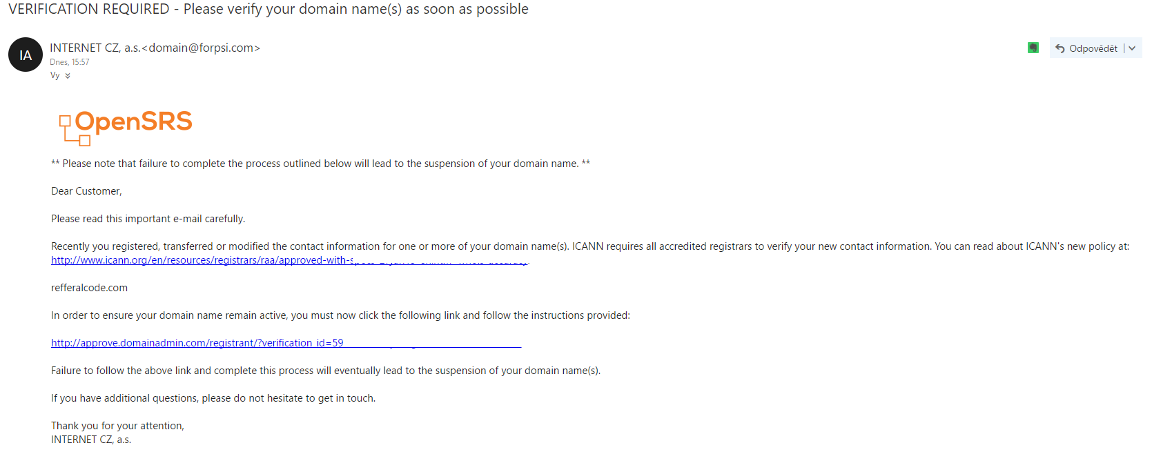 Před chvíli jsem si zakoupil doménu a následně mi přišel email viz foto níže. Chci se zeptat zda je to běžný proces a jestli jim to mám odklikat nebo zda se jedna o phishing. U dříve registrovaných domén mi nic takového nepřišlo.