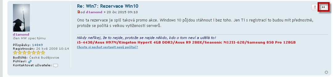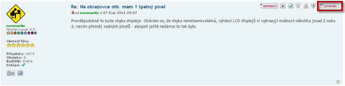 - v případě, že si přejete reagovat na konkrétní příspěvek uvnitř tématu, lze pro odpověď použít tlačítko "Citovat"