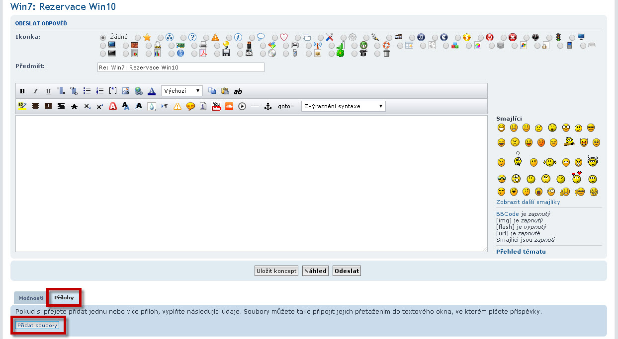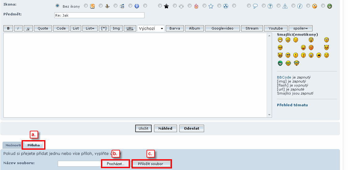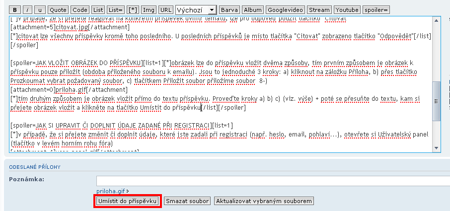 - obrázek lze do příspěvku vložit dvěma způsoby, tím prvním způsobem je obrázek k příspěvku pouze přiložit (obdoba přiloženého souboru k emailu). Jsou to jednoduché 3 kroky: a) kliknout na záložku Příloha, b) přes tlačítko Prozkoumat vybrat požadovaný soubor, c) tlačítkem "Přiložit soubor" přiložíme soubor