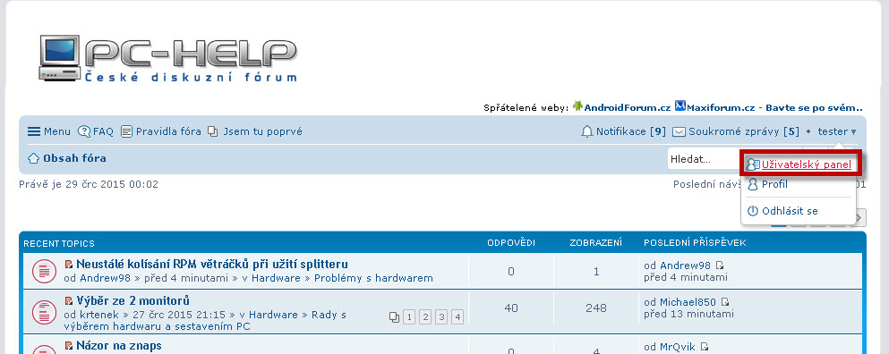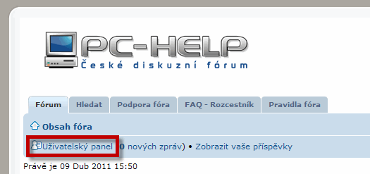 - v případě, že si přejete změnit či doplnit údaje, které jste zadali při registraci (např. heslo, email, pohlaví...), otevřete si Uživatelský panel (tlačítko v levém horním rohu fóra)