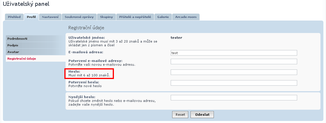 - Uživatelský panel je tématicky dělen do několika záložek, např. heslo změníte v záložce Profil -> Registrační údaje