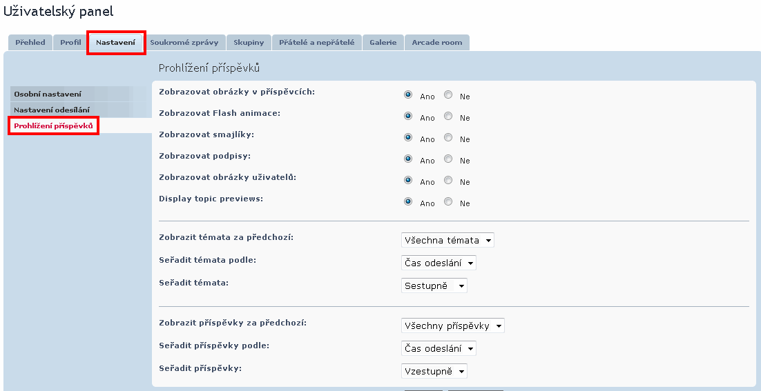 - poté klikněte na záložku Nastavení a Prohlížení příspěvků
