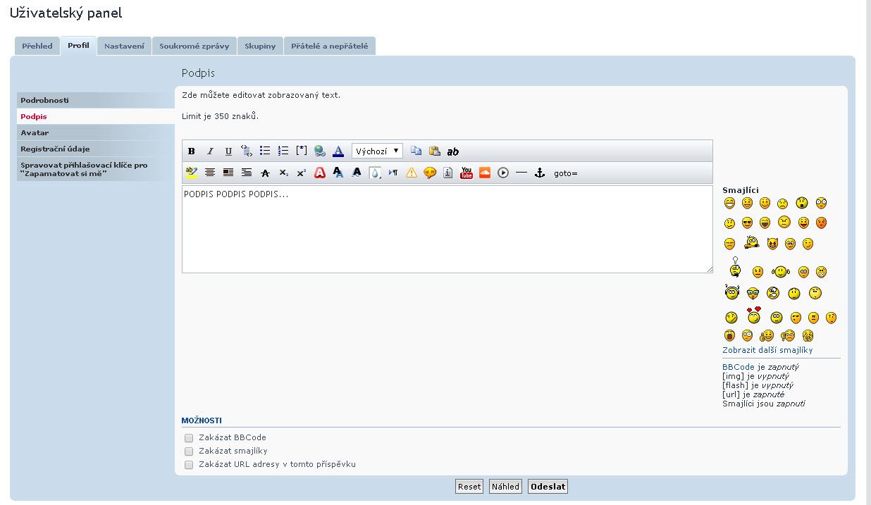 - dále byste si mohli přát doplnit podpis (text, který se zobrazí za každým vaším příspěvkem). Podpis nastavíte přes Profil -> Podpis. Při psaní podpisu prosím respektujte pravidla fóra.