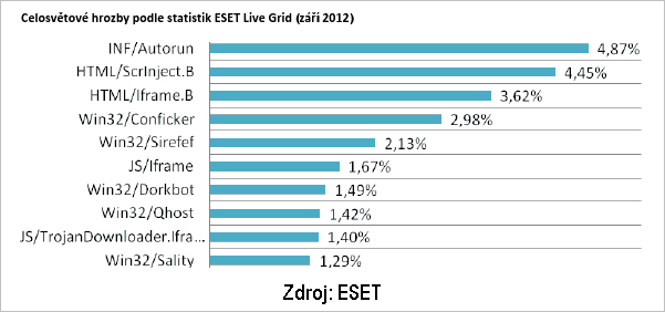 Podle společnosti ESET už pět měsíců v řadě vévodí žebříčku nejrozšířenějších resp. nejčastěji detekovaným záškodnických programů zástupci skupiny INF/Autorun. Podle čerstvých statistik za září 2012 byl podíl této skupiny mezi rozpoznanými hrozbami 4,87 procenta. V průměru tedy takřka každá pátá nalezená počítačová infekce představovala zástupce INF/Autorun.