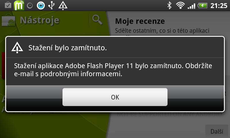 Na některých zařízeních se systémem Android v posledních dnech začalo zobrazovat zamítnutí stažení aktualizace aplikace Flash Player, která se ale přitom automaticky nabízí. Zajímavé je, že na některých zařízeních k aktualizaci dojde bez problémů, ovšem na jiných se objeví zpráva o jejím zamítnutí s příslibem zaslání podrobnějších informací e-mailem. K tomu ovšem ani po několika dnech nedošlo.