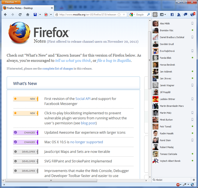 Firefox 17 přináší Social API a podporuje Facebook Chat