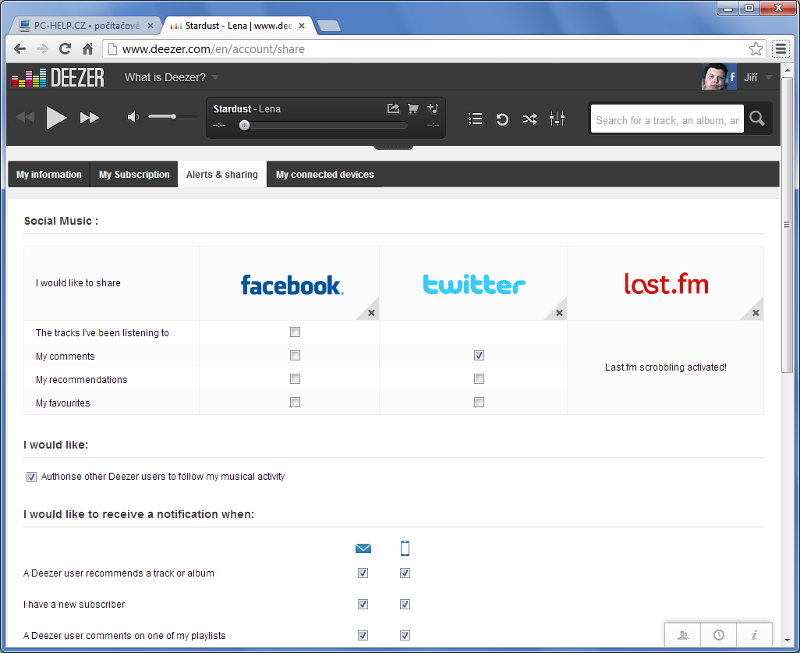 Deezer lze navíc propojit s účtem na Last.fm, takže je možné si takto „vydobýt“ víceméně původní funkcionalitu: Deezer poskytuje poslech hudby, Last.fm generuje statistiky a doporučuje další zajímavé interprety a jejich tvorbu dle individuálního vkusu každého uživatele. Deezer lze rovněž propojit se sociálními sítěmi Facebook a Twitter pro ty, kteří touží troubit do světa, kterou hudbu poslouchají a která se jim líbí.